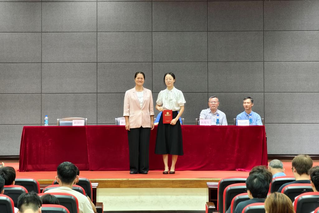 林伟英、谢卫红分别为学校研究生教学成果奖获奖代表孙有发、岳鹄老师颁发证书,为博士生国家奖学金获得者马利同学颁发证书。
