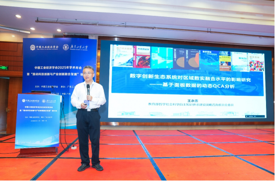 王永贵教授以“数字创新生态系统对区域数实融合影响路径研究——基于面板数据的动态分析”为题作主旨演讲。他从数字创新生态系统推动和支撑数实融合为切入点,以宏观眼光审视数字创新生态系统推动区域数实融合的多条组态路径,为区域数实融合研究和实践提供参考和借鉴。