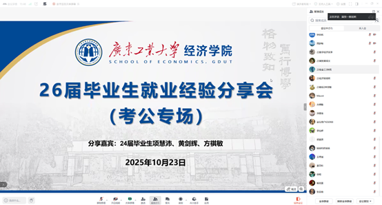为帮助同学们全面了解国考、省考,精准掌握备考核心技巧,有效提升就业竞争力,结合学院“远航计划”工作方案,10月23日晚,学院在线上召开第三期就业经验分享会(考公专场)。分享会邀请学院24届毕业生项慧沛、黄剑辉、方祺敏主讲。学院26届本科毕业生彭宇同学主持。