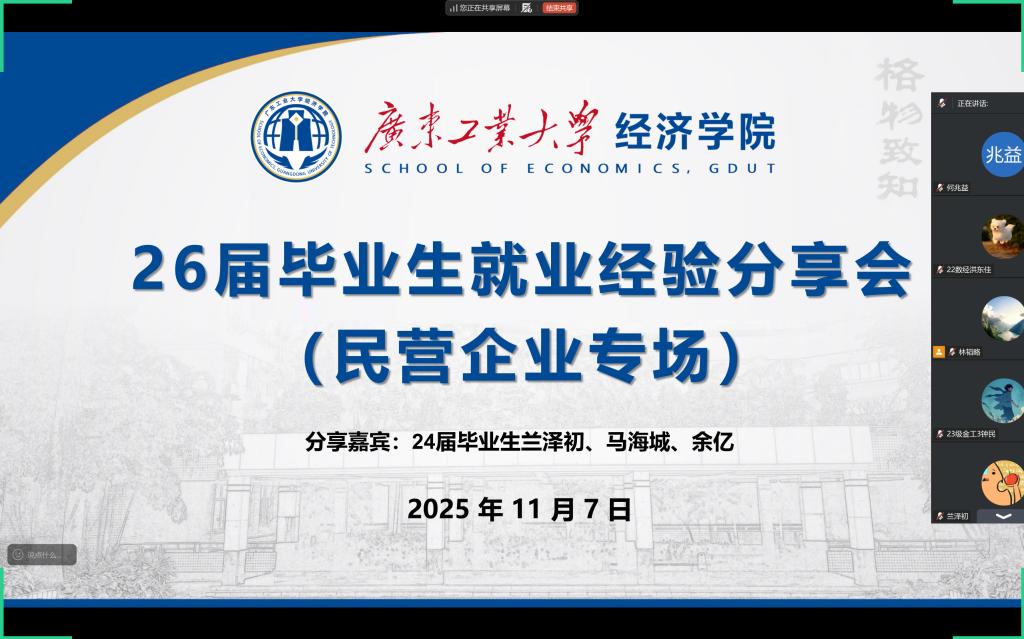 为帮助学院26届毕业生把握就业形势,筑牢求职信心,抓住求职黄金期,结合学院“远航计划”工作方案,11月7日晚,学院在线上召开第四期就业经验分享会(民营企业专场)。分享会邀请学院24届毕业生兰泽初、马海城、余亿主讲。学院26届本科毕业生何兆益同学主持。