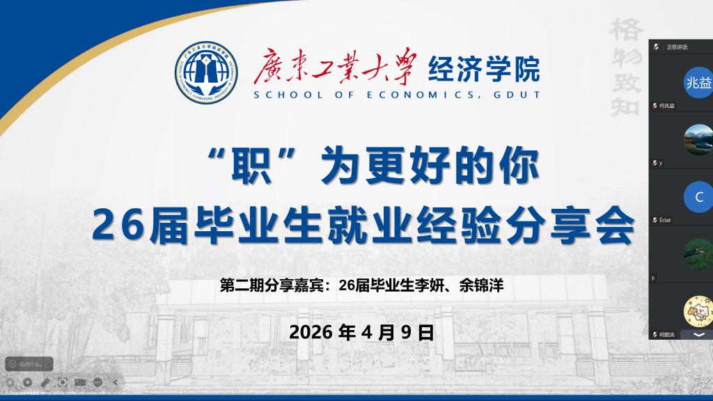 为持续助力学院毕业生明晰就业形势、坚定求职信念,全面提升综合就业竞争力,4月9日晚,学院在线上举办“‘职’为更好的你”之26届毕业生就业经验分享会(第二期)。本次分享会邀请已顺利落实毕业去向的毕业生李妍、余锦洋担任主讲,何兆益同学主持。
